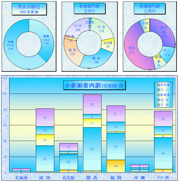 | 出発空港 | 教会数 | 男 性 | 女 性 | 教役者 | 教役者夫人 | 献身者 | 信 徒 | 子 供 | 合 計 | |