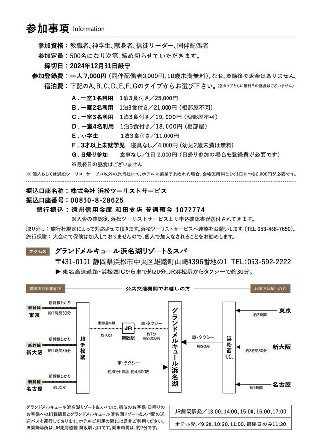 JPFカンファレンス2025は来年2025年2月4日(火)〜7日(金)に3泊4日で静岡県浜名湖畔の『グランドメルキュール浜名湖リゾート&スパ』(旧称:ザ浜名湖/浜名湖ロイヤルホテル)で開催されます! ペンテコステ教役者大会から数えて60回の記念大会になります! 会場ホテルが今年2024年4月よりグレードアップしています。