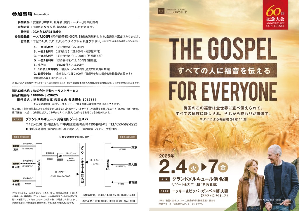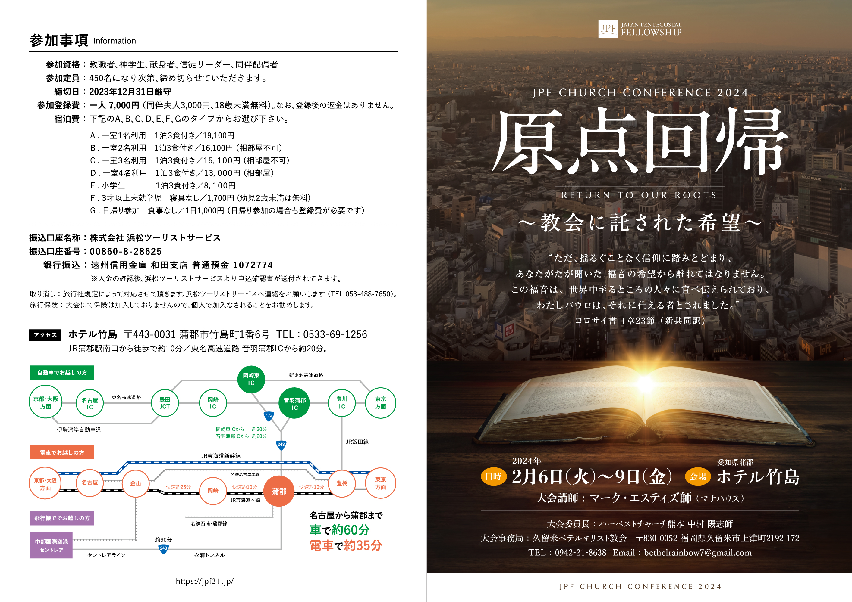 また、物価高騰等で宿泊費などの圧迫を懸念しまして、2泊3日に圧縮して開催いたしますが、4回の聖会は変わらずに行います。